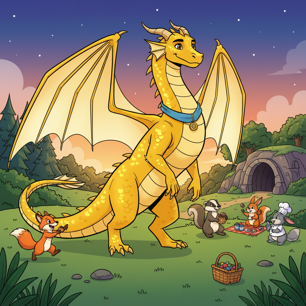 Solbrand bodde i en grön, mjuk dal där gräset kittlade tassarna när man gick. Varje morgon när solen steg upp glittrade hans gyllene fjäll så starkt att fåglarna trodde att det fanns två solar på himlen.
