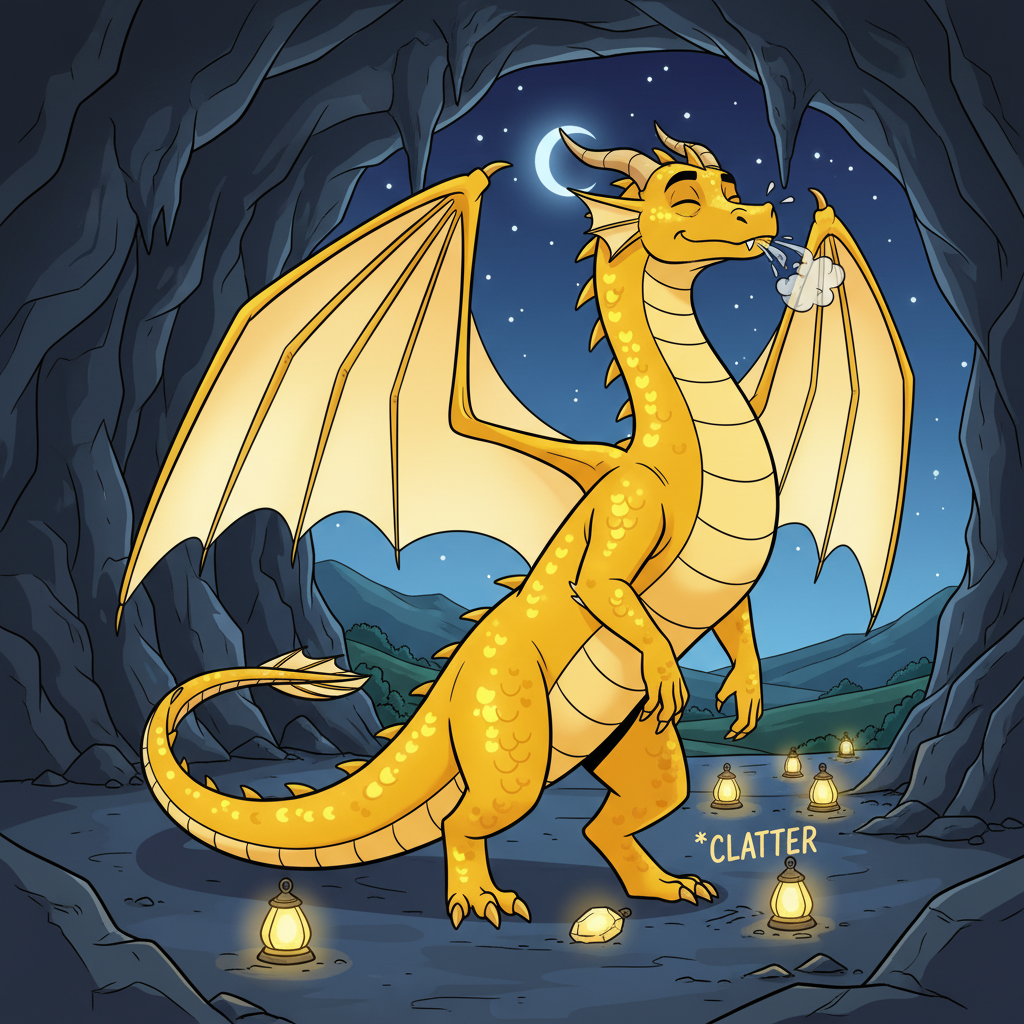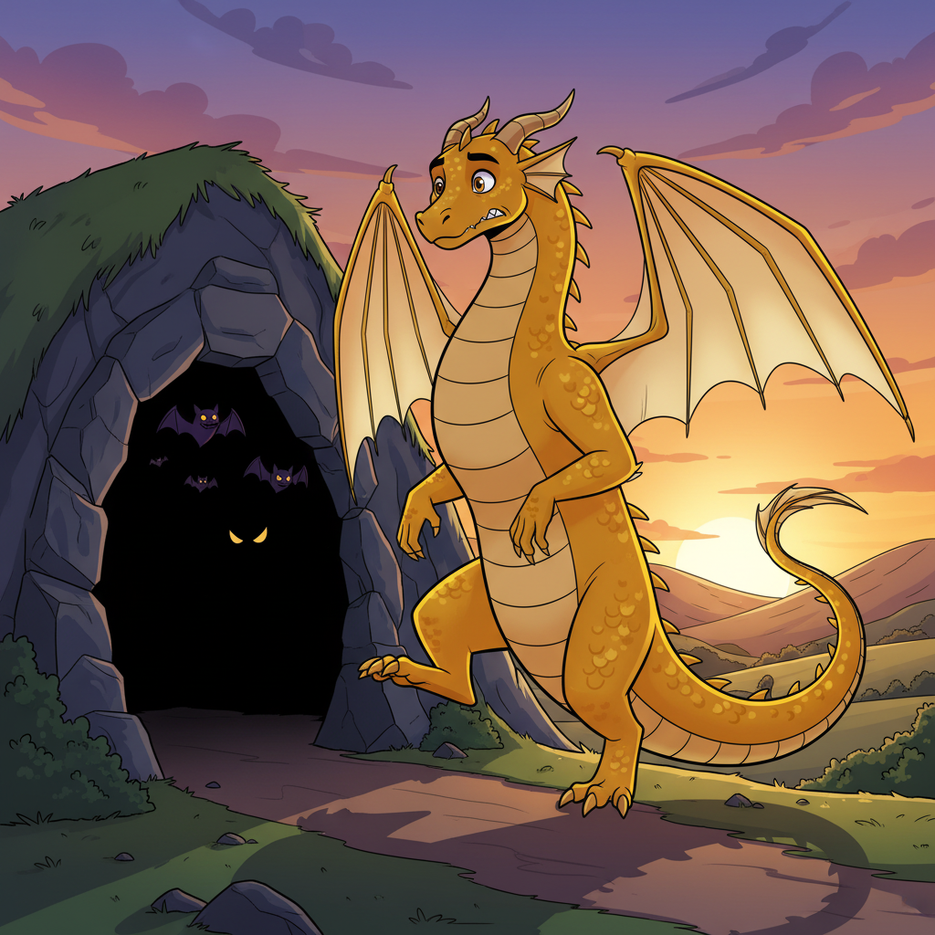 Han brukade alltid smyga hem till sin grotta precis innan solen försvann helt. Där inne tände han små glimmande stenlyktor som lyste mjukt och varmt. Då kände han sig trygg.