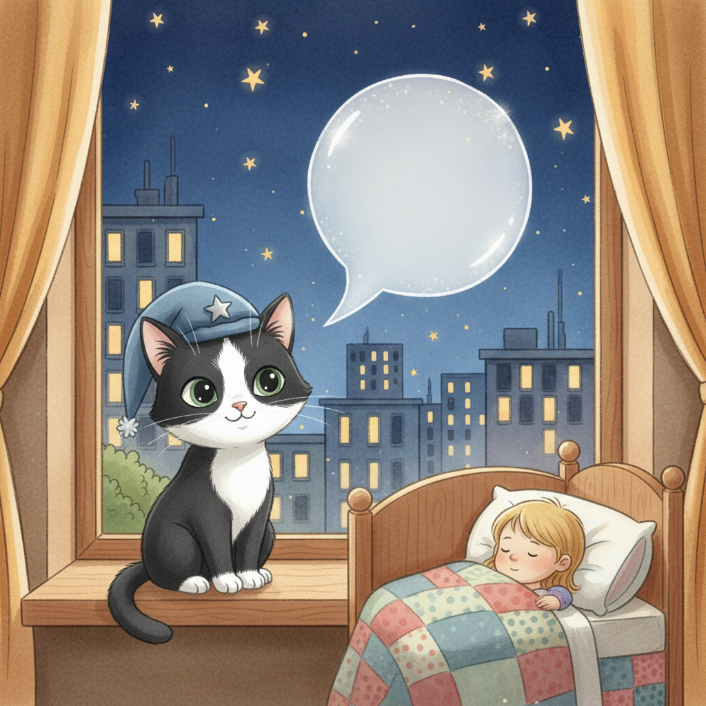 Zorro satt på sin favoritfönsterbräda, så stilla att man nästan kunde tro att han var en liten staty. Den svarta och vita pälsen glänste svagt i kvällsljuset och den blå nattmössan hängde ner över ena örat. I spetsen på mössan dinglade en liten silverstjärna som gav ifrån sig ett svagt, klingande ljud när han rörde sig.
