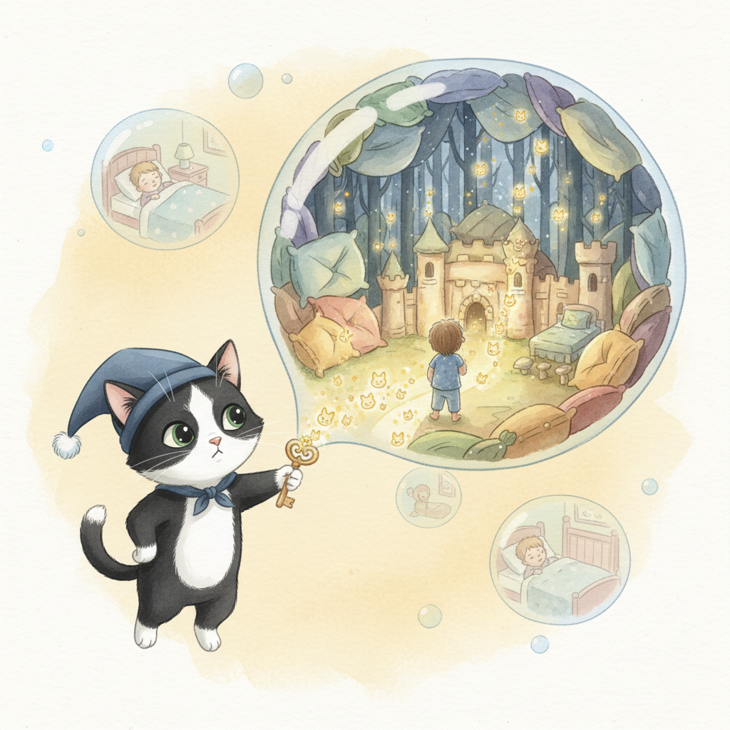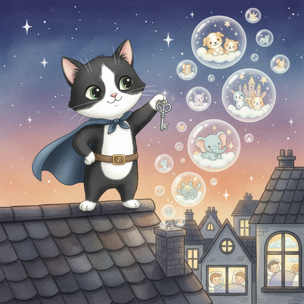 Han nuddade bubblan med sin tass. Ett svagt “plim” hördes, och drömbubblan fylldes av fluffiga kuddträd, bulliga kuddstenar och ett helt kuddslott. Zorro nickade nöjt och lät bubblan sväva ut genom fönstret, bort mot flickans hus.